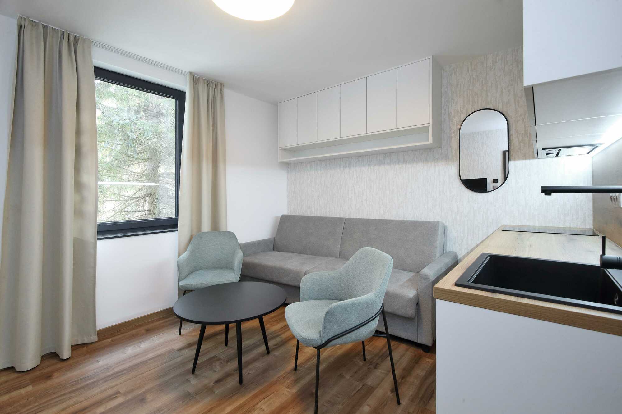 Jednopokojový apartmán, který hosté volí především pro možnost vlastního stravování. Součástí je plně vybavený kuchyňský kout s lednicí, sporákem a rychlovarnou konvicí. Součástí apartmánu je moderní koupelna se sprchovým koutem, ručníky a základní hotelovou kosmetikou. Okna jsou situována směrem k příjezdové straně hotelu. Nechybí TV a Wi-Fi připojení k internetu.