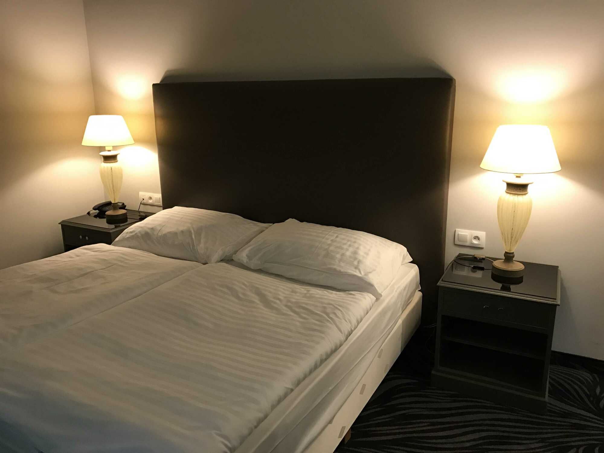 Das Vierbett-Junior-Suite bietet zwei getrennte Räume. Der Hauptraum ist mit einem King-Size-Doppelbett mit Blick in den Park ausgestattet, im Nebenraum befinden sich zwei separate Einzelbetten. Das Zimmer verfügt über ein Badezimmer mit Dusche, Handtüchern und Basis-Hotelkosmetik. Zur Ausstattung gehören außerdem eine Minibar, TV und WLAN-Verbindung.