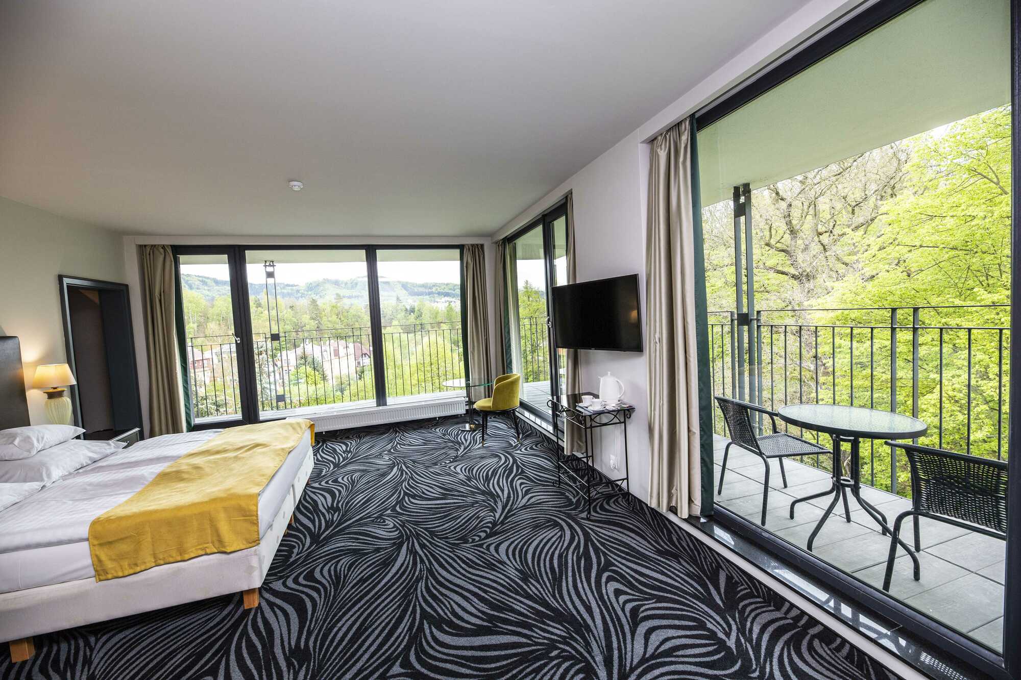 Das exklusive Zimmer der Kategorie De Luxe Panorama Park besticht durch seine Geräumigkeit und Helligkeit, die durch eine Eckterrasse mit Blick auf den angrenzenden Park ergänzt wird. Das Zimmer ist mit einem King-Size-Doppelbett und einem modernen Badezimmer mit Dusche, Handtüchern und Hotelkosmetik ausgestattet. Ein Kaffee- und Teeset mit Wasserkocher, eine Minibar, ein Fernseher und eine WLAN-Verbindung sind ebenfalls vorhanden.